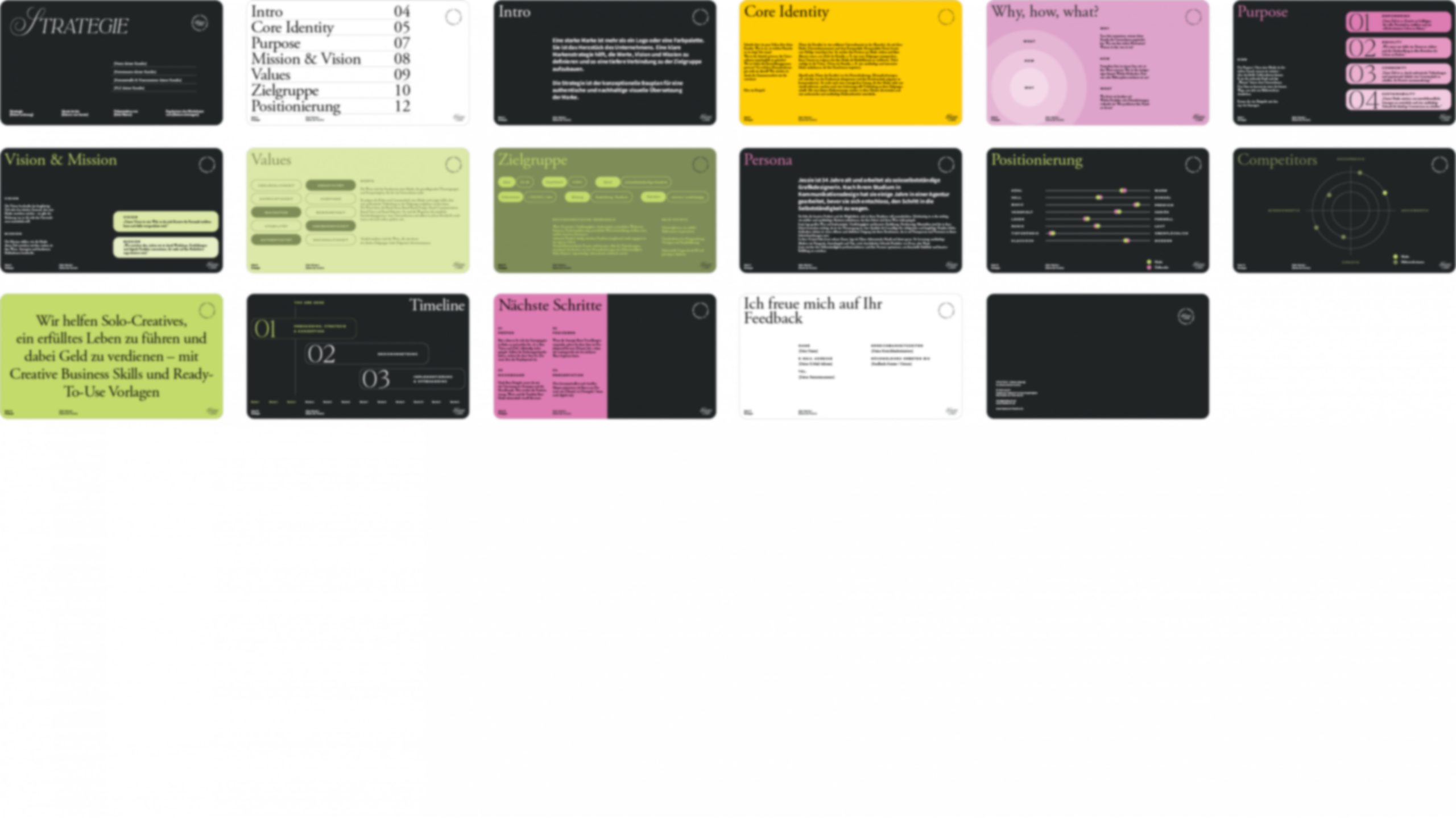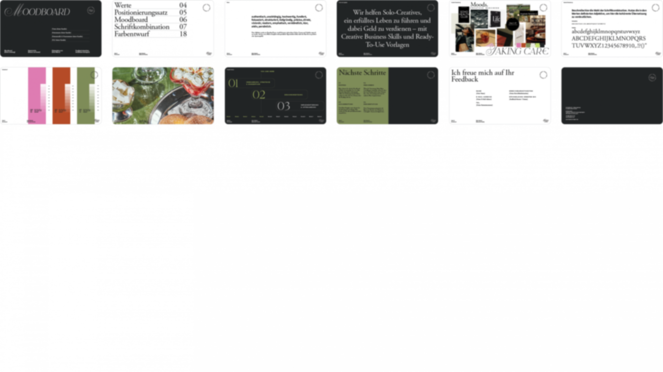 Lohnt sich's?Fortbildungen und Coachings, die nicht speziell für soloselbstständige Kreative konzipiert sind, kosten in der Regel ab 3.500 € netto aufwärts. Einzelne Tages-Workshops zu nur einem Schwerpunktthema liegen meist bei rund 700 € netto. Allein das enthaltene Templates-Bundle hat einen Wert von 644 € — und ist in deinem Paket zusammen mit dem Workbook bereits enthalten. Das macht das Angebot wirklich zu einem echten No-Brainer.